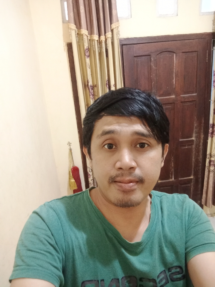 A person with dark hair and a mustache is centered in the frame, wearing a green t-shirt. The individual looks directly at the viewer. Behind the person is a wooden door and curtains, partially visible on either side. The background also includes off-white walls with hints of a window and decorative tassel hanging. The lighting in the room appears warm and soft.
