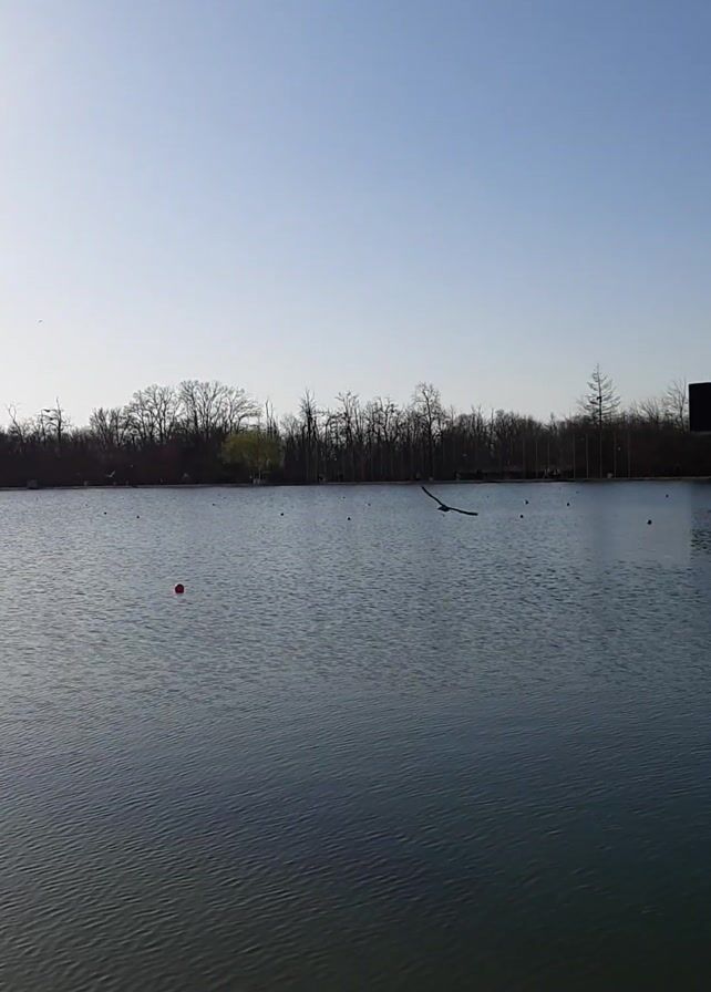 body of water against a clear blue sky. The water is calm with slight ripples and reflections. Along the edge of the water is a line of trees with bare branches. A few birds can be seen flying across the scene. There is a black rectangular object positioned behind the trees. A red ball is floating in the water. The video is taken from a static, ground-level perspective, oriented vertically.