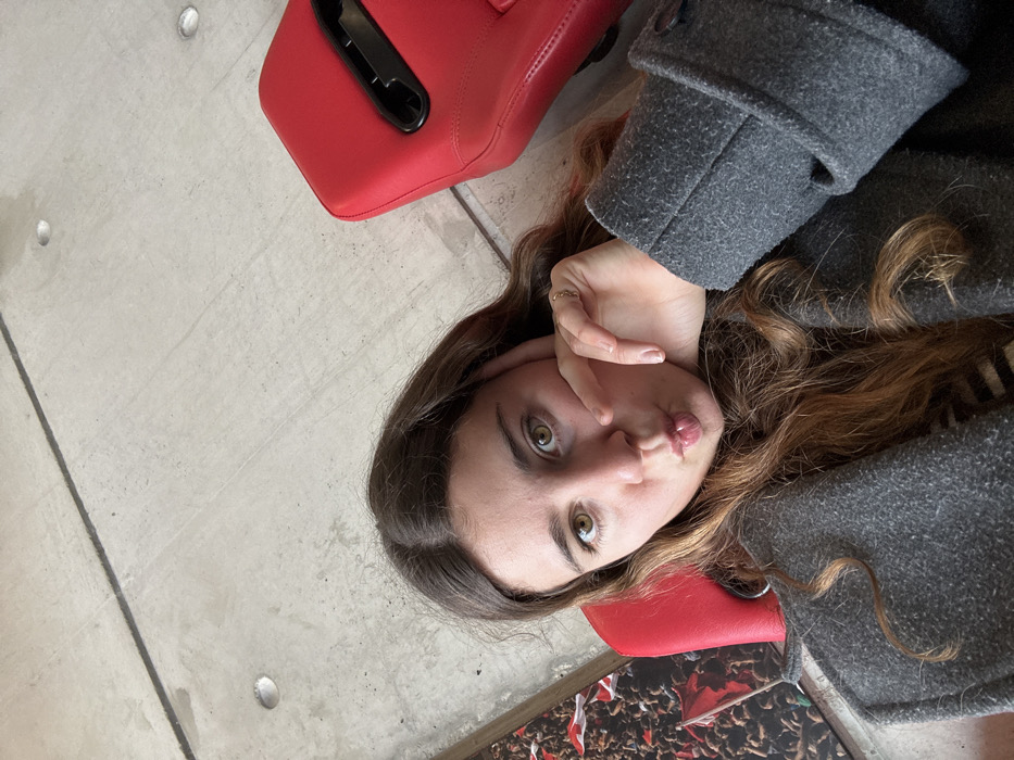 The scene is an interior shot, located within the Benfica Museum (Museu Cosme Damião) or a related fan experience area at the Estádio da Luz complex in Lisbon, Portugal. A young adult female with long brown hair, wearing a dark grey textured coat over a striped garment, is seated in a red, bucket-style chair. Her light-colored eyes are directed towards the camera, and her lips are pursed. Her left hand, adorned with a ring on the ring finger, rests near her chin. A second, identical red seat is partially visible in the upper right background. The general background consists of a light grey concrete wall or ceiling featuring dark linear patterns and several circular indentations. To the lower left, a large graphic display or poster depicts a dense crowd, many individuals holding red and white flags, consistent with the colors of the Sport Lisboa e Benfica team.
