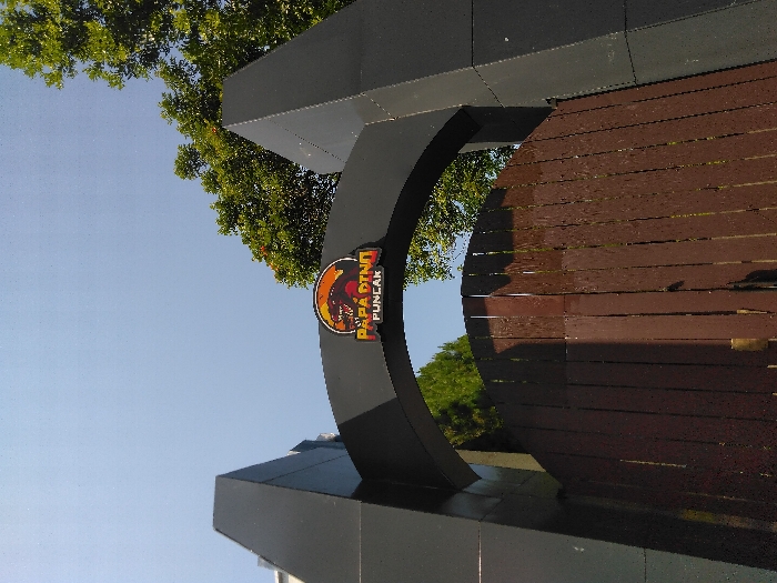 The image displays a dark grey archway structure positioned above a dark brown, vertically paneled wooden gate, viewed from a low-angle perspective. Centrally affixed to the arch is a circular emblem featuring a dinosaur silhouette against an orange and black background, with the white text "PAPA DINO PUNCAK" inscribed below the silhouette. Green tree foliage is visible through the arch opening and to the upper right of the frame, set against a clear blue sky. No individuals or active interactions are present. The scene is situated in Ban Xieng Lom, Laos.
