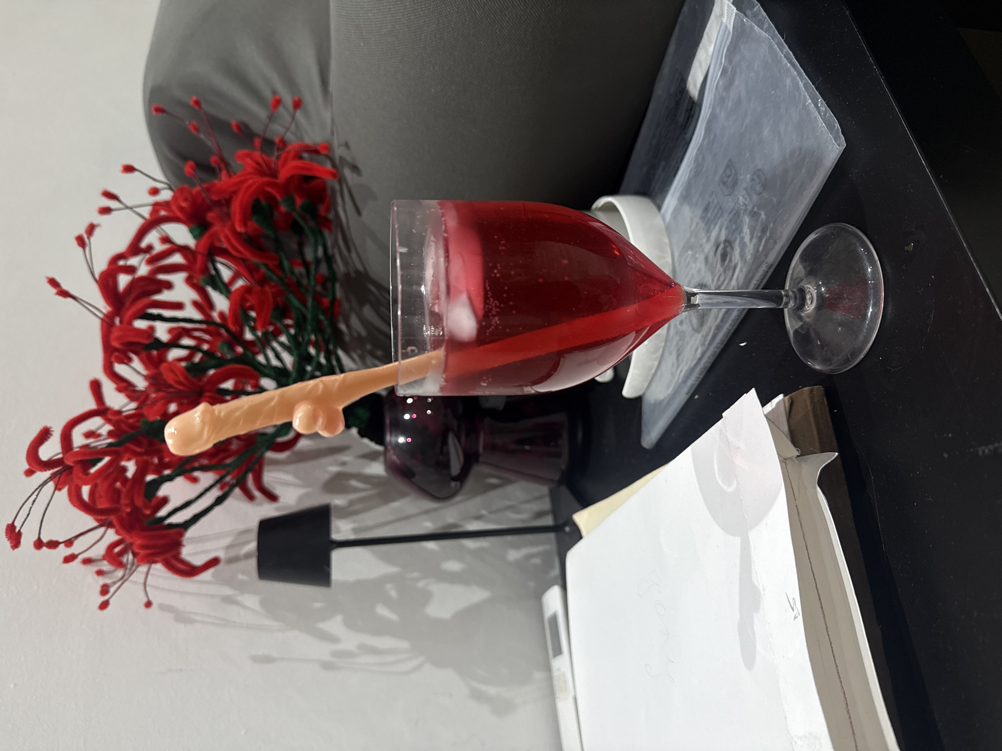 A wine glass filled with red liquid rests on a black surface next to a stack of white papers and a clear plastic bag. A suggestive object is placed inside the glass and rests against a bouquet of red fuzzy flowers. A sofa is in the background.