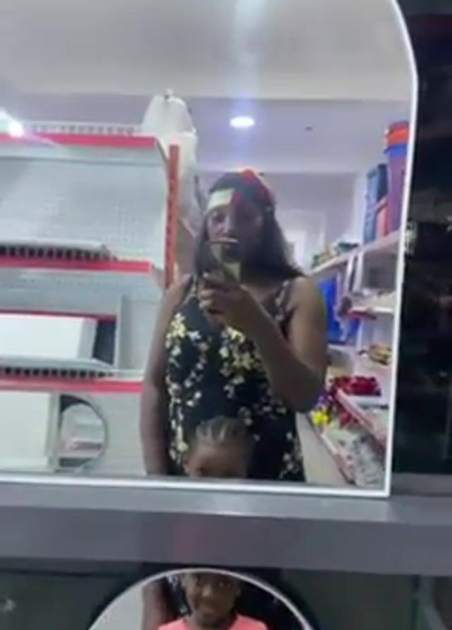 A woman wearing a floral dress and a head wrap takes a selfie in a mirror. A young girl wearing a pink shirt and yellow pants stands in front of the woman. The reflection of both figures is visible in both mirrors. The background shows shelves with items in what appears to be a store.