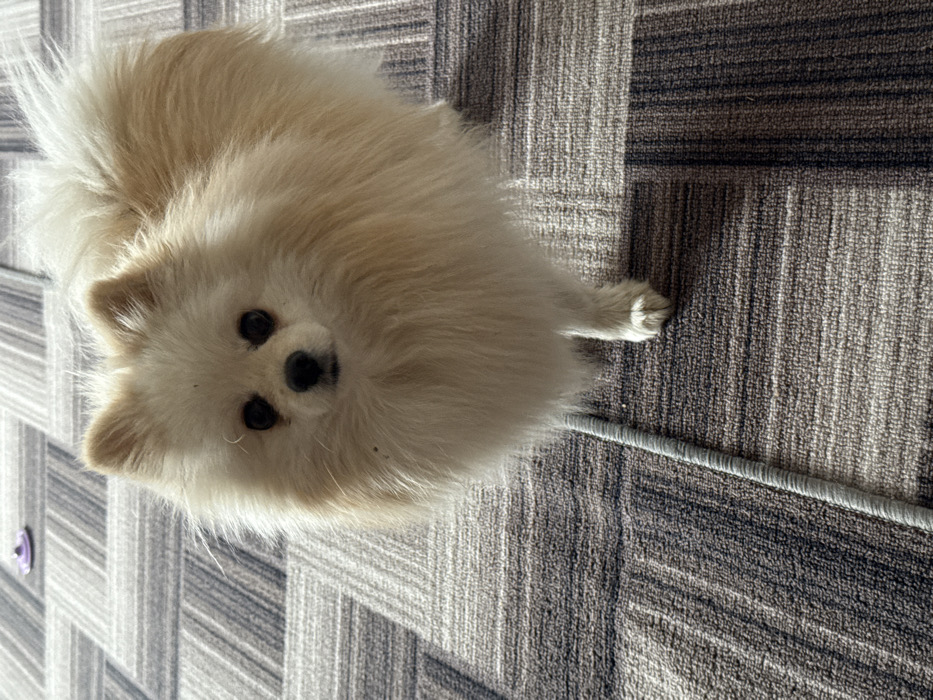 - "A cream-colored Pomeranian dog is positioned prominently on a multi-toned grey and brown patterned carpet in Makiivka, Ukraine" by FM-yY1zz1, licensed under CC BY 4.0