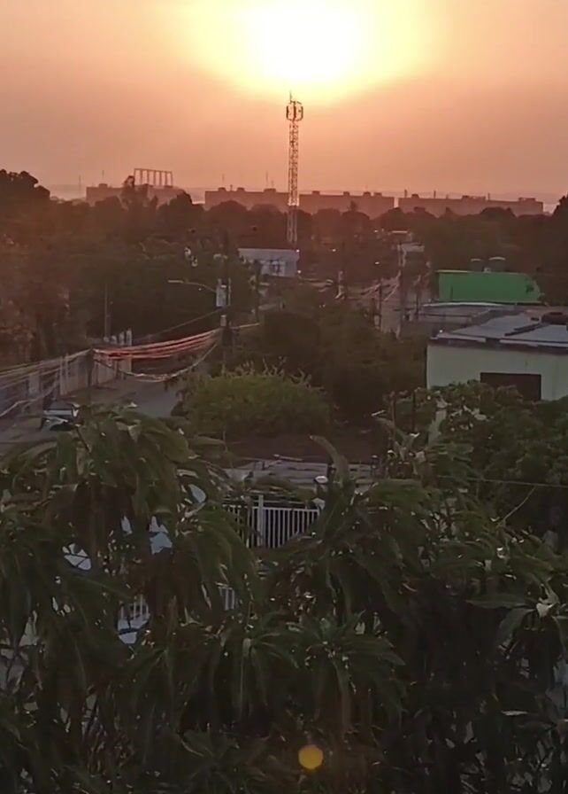 sunset in a suburban neighborhood. The sun is visible in the sky, shining brightly and casting a warm orange glow over the surroundings. Below the sun, a cell phone tower stands tall, slightly obscuring the horizon. The foreground features lush green trees with dense foliage, partially blocking the view of houses and buildings in the neighborhood. A road is visible, with a vehicle passing. The sky is clear, with faint hues of pink and orange blending into the blue. The camera is steady, capturing the serene atmosphere of the setting. The text "Infinix NOTE 40Pro" is visible at the bottom left corner of the frame, indicating the device used to record the video.
