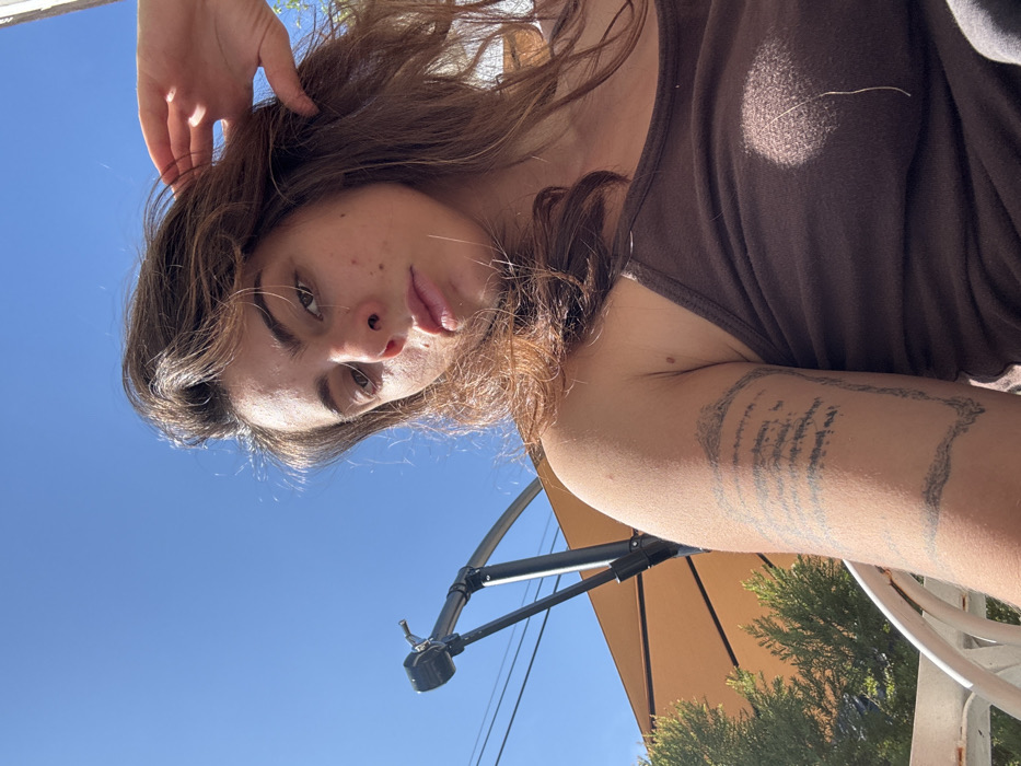 A young woman with brown hair looks down at the camera, partially obscured by her hand above her head. She wears a brown tank top, and part of a tattoo is visible on her arm. An umbrella mechanism, part of an umbrella, and a green bush are below her. The bright blue sky is visible in the background.