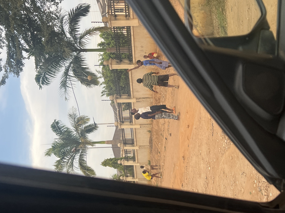 A view from inside a vehicle shows several people on a dirt road beside a walled property with palm trees. One person, wearing blue, is reaching up towards another person with stripes, who is bending over. Two people wearing light-colored shirts are standing, one on top of the other. Further down the road, two small children wearing yellow are squatting on the ground.