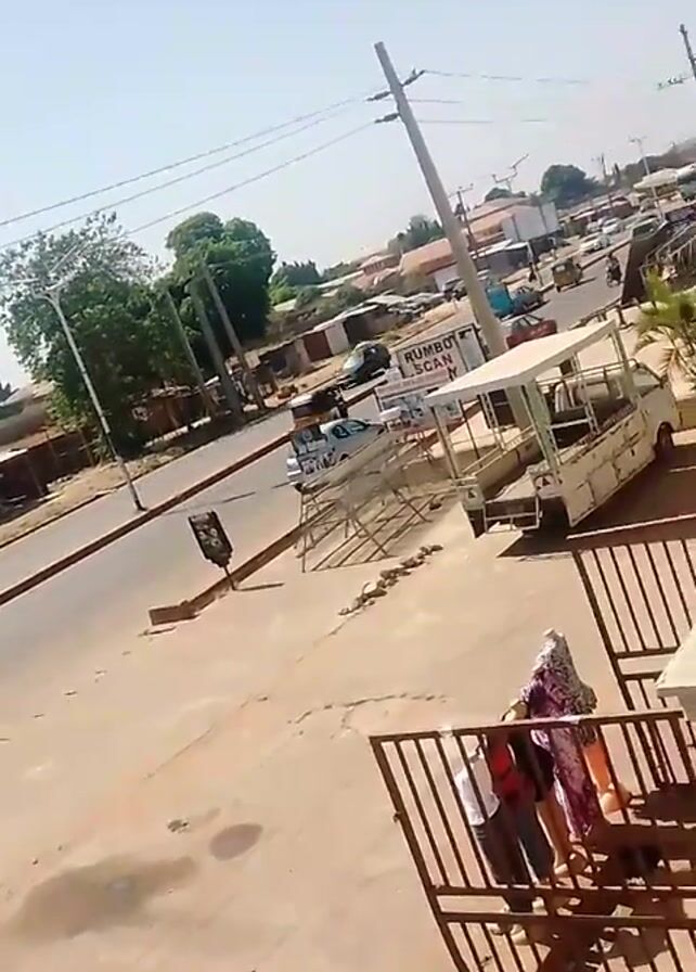 view from an elevated position, likely a balcony, overlooking a street scene in what appears to be a town or small city. The weather is sunny, with a clear sky. There is moderate vehicular traffic on the road, including cars, motorcycles, and a three-wheeled vehicle. A white truck or van with an open back, possibly a public transport vehicle, is parked near a sign that reads "RUMBO SCAM." Several people stand near the railing of the balcony where the video is taken. They are likely observing the scene below. The surrounding area includes buildings, trees, and utility poles. The overall impression is that it is a typical day in a bustling urban setting.