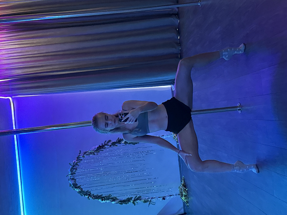 A woman is taking a selfie while doing pole fitness. She wears black shorts and a green top. She has socks on. The background includes blue lighting, curtains, and a decorative heart. She is holding herself in a pole position with one leg bent. She is looking at her phone screen as she takes the picture.