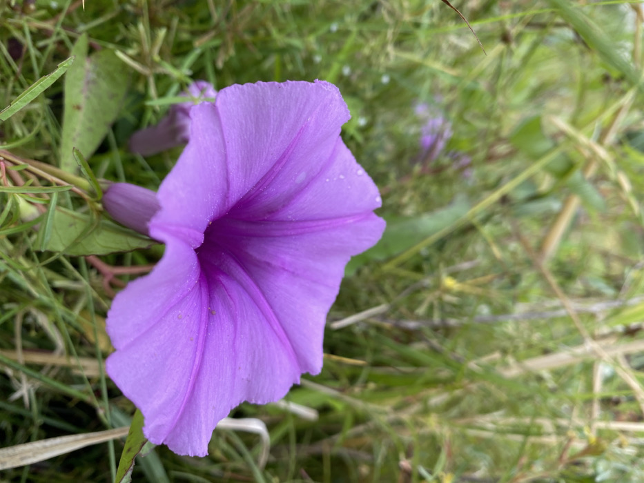 This image displays a single, vibrant purple, trumpet-shaped flower in close-up, photographed in Ajaokuta, Nigeria. The flower, likely a species of morning glory or similar vine, exhibits a lighter lavender shade on its outer petals that deepens to a richer purple in its central throat. Small, clear water droplets are visible on the petal surfaces, indicating recent moisture. The background is a soft-focus blur of diverse green foliage, including tall grasses and leafy plants, with faint suggestions of additional purple flowers in the distance. The scene is an outdoor, natural environment, likely an overgrown area, illuminated by soft, diffused light. There are no human subjects, actions, or interactions depicted.