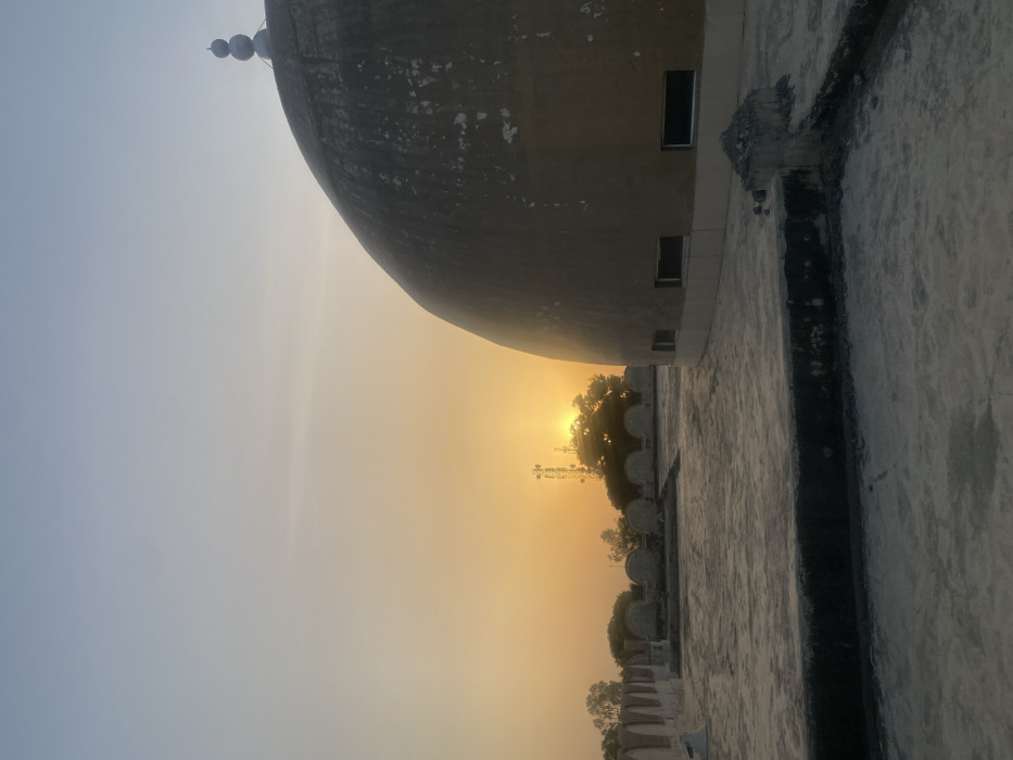 An elevated outdoor scene in Baganakwo, Nigeria, captured during either sunrise or sunset. The right side of the frame is dominated by a large, weathered, yellowish-brown domed structure featuring a three-tiered finial at its apex and several small, dark rectangular windows near its base. The midground shows a flat, dusty concrete rooftop, extending to the left and bordered by a low parapet wall with arched crenellations. The low sun is visible on the horizon in the background, partially obscured by a cluster of green trees. Multiple metal communication towers with antennae are visible above and behind the trees. No individuals or animals are present.