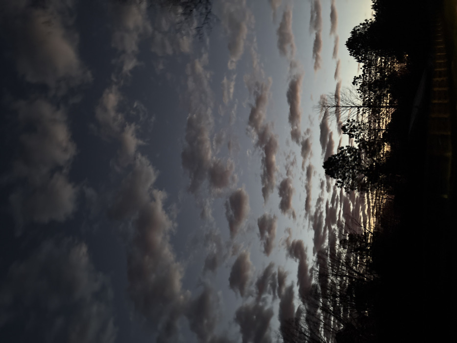 The image depicts an outdoor twilight scene over Ball Ground, United States, characterized by a cloud-filled sky above a silhouetted tree line. The upper two-thirds of the frame consist of the sky, which transitions from a dark blue-grey at the zenith to lighter shades of blue, purple, and orange-pink near the horizon. Numerous altocumulus-like clouds are present, appearing as distinct, rounded, or elongated masses, with their undersides illuminated by a warm, reddish-orange glow from the unseen sun. A narrow, bright band of orange and yellow light is visible directly above the horizon, situated between the clouds and the tree line, indicating either sunrise or sunset conditions. The lower third of the image is dominated by a dark, undifferentiated silhouette of a tree line, consisting primarily of conifers with dense foliage and some deciduous trees with bare branches. No individual trees are clearly distinguishable due to the severe underexposure. A faint, dark, horizontal structure, consistent with a fence or low barrier, is partially visible along the very bottom edge of the frame, below the tree line. No people, animals, or active subjects are present in the scene.