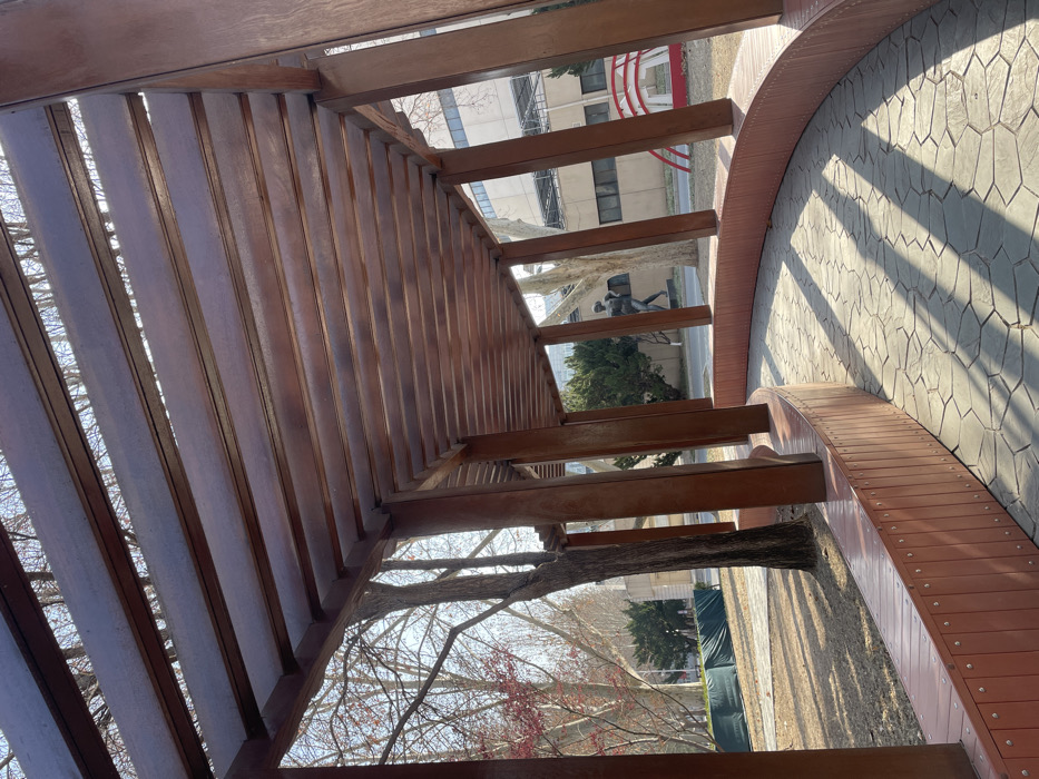 A unique perspective under a wooden pergola with repeating slats. Outside the structure, trees with sparse branches and a building are visible. A circular bench curves around a walkway paved with irregular stones. A bronze statue stands near the walkway, adding an artistic element to the outdoor setting. Sunlight filters through the pergola, casting shadows on the bench and walkway.