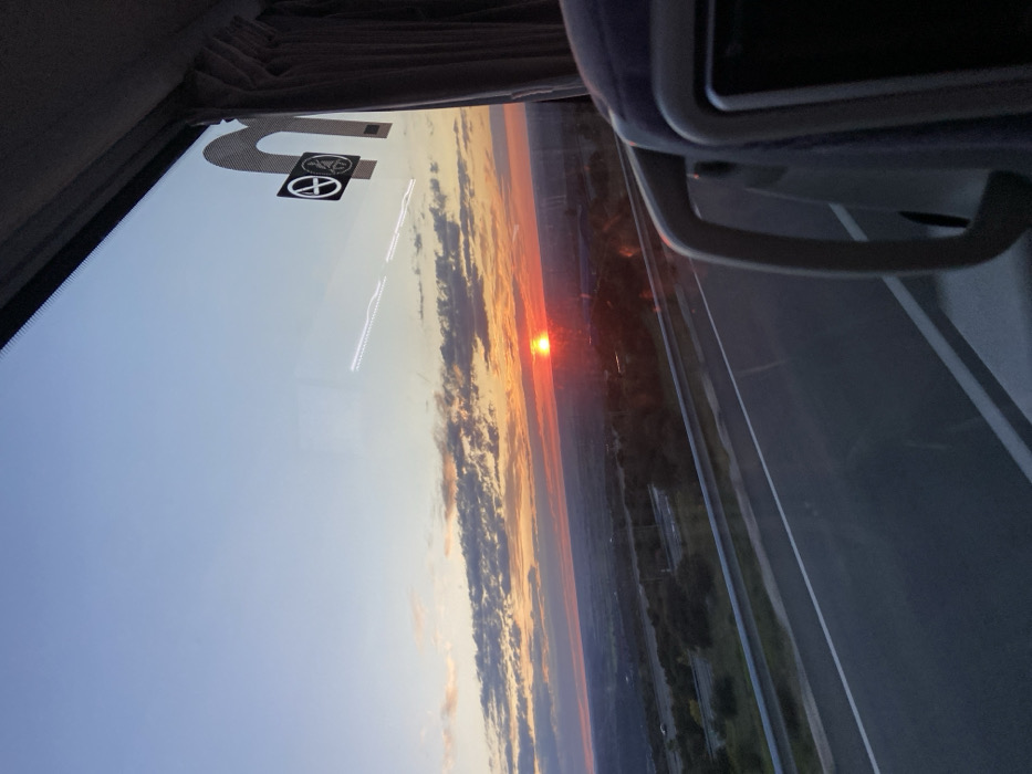 sunset over a highway, viewed from inside a vehicle