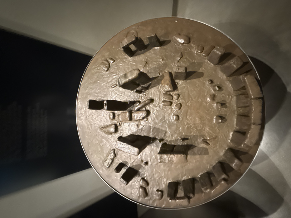 A circular, bronze-toned scale model of the prehistoric monument of Stonehenge is displayed, positioned within a visitor center near Amesbury, United Kingdom
