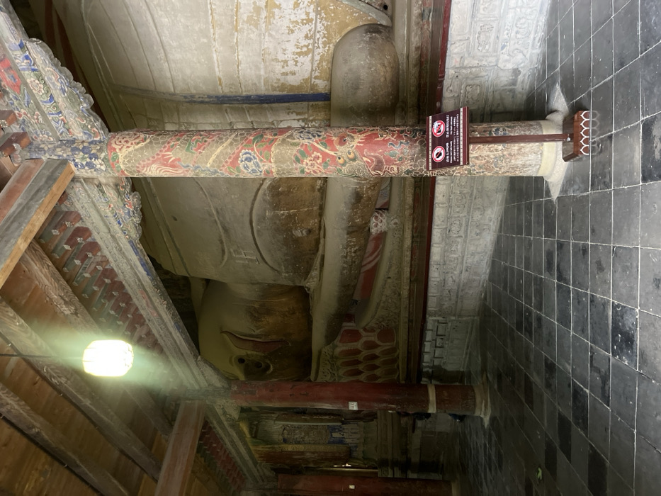 The image depicts the interior of the Giant Buddha Temple (Dafo Temple) in Zhangye, China