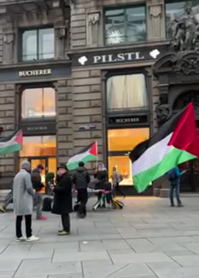 group of people standing in front of a building with the signs "BUCHERER" and "PILSTL." Several Palestinian flags are visible, being held by individuals in the group. There are tables and other objects set up nearby. People are seen walking past the group on the sidewalk. The building's architecture is ornate and classical, with large windows. The day appears overcast.
