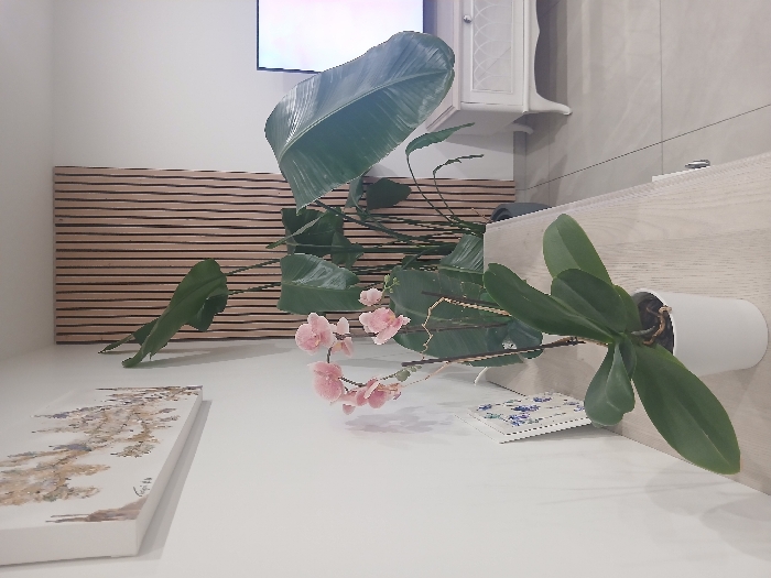 The image displays an interior residential space in Illkirch-Graffenstaden, France. The scene features light-colored walls and light-toned flooring. In the immediate foreground, a white cylindrical pot containing a Phalaenopsis orchid plant with dark green leaves and multiple stems bearing pink blossoms is positioned on a light wood-grain console table. To the left of the orchid, a white framed object with blue decorative patterns rests on the same console. Behind the orchid, a larger potted plant with broad, dark green leaves is contained within a dark grey or black pot. A vertical section of the wall behind these plants is covered with light wood-colored slatted panels. Above the console, on the white wall to the left, a rectangular piece of artwork with abstract, textured patterns in beige and white is mounted. In the background on the right, a white console table with ornate, possibly carved, details and white legs is visible, topped by a television screen displaying a light, undefined image or gradient. No individuals or active interactions are present in the scene.