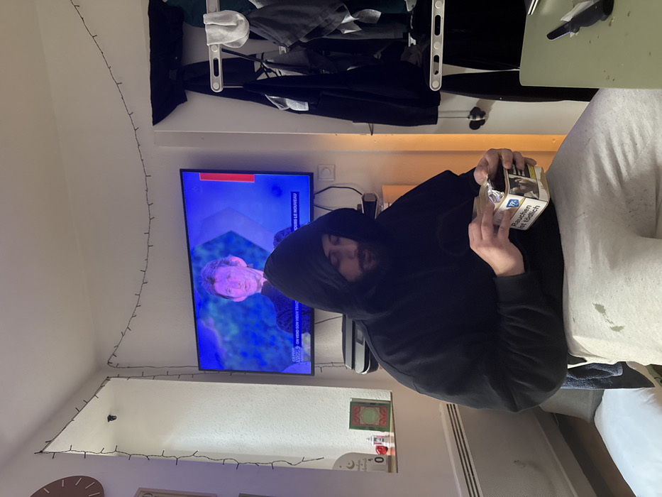 An interior scene depicts an adult male, mid-20s to 30s, with a beard, seated and wearing a black hooded sweatshirt with the hood up and light grey sweatpants. He is focused on manipulating a brown tobacco pouch that features a German-language health warning, "Rauchen ist tödlich" (Smoking is deadly). The individual is positioned in what appears to be a residential living space in Strasbourg, France. A large flat-screen television mounted on the wall behind him displays a French news program featuring a male figure and text, including "LE NOUVEAU." To the left of the image, a window recess is visible with string lights draped along its frame and wall. Below the window, a white radiator is present. A white shelf or ledge above the radiator holds a green book, a calendar displaying '0', small red and white objects, and a crescent moon decoration. A wall clock with brown numbers is partially visible in the upper left corner. Below the television, a device resembling a printer is situated on a shelf. To the right, a clothes drying rack or hanger with various dark garments is visible. A light green tabletop in the lower right foreground contains a black utility knife and a piece of white paper. A white pillow is on the floor in the lower left. The environment suggests an indoor, lived-in setting. The combination of French language on the television and German language on the tobacco pouch is consistent with the Alsace region, specifically Strasbourg.