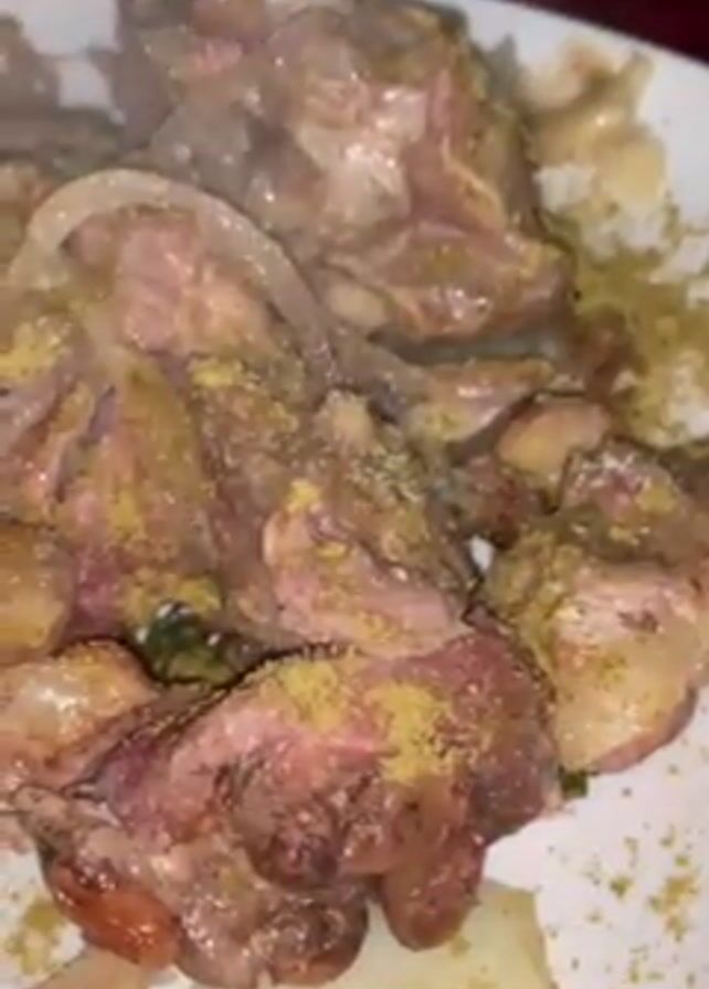 close-up of a plate of food. The dish appears to contain cooked meat, possibly liver or some other kind of organ meat, topped with a yellow powder-like spice and thin onion slices. Some potato slices are visible on the bottom of the plate. Steam rises from the meat, suggesting it is freshly cooked and still warm. A person's hand enters the frame briefly, possibly to adjust the placement of the food. The speaker says "Merry Christmas".