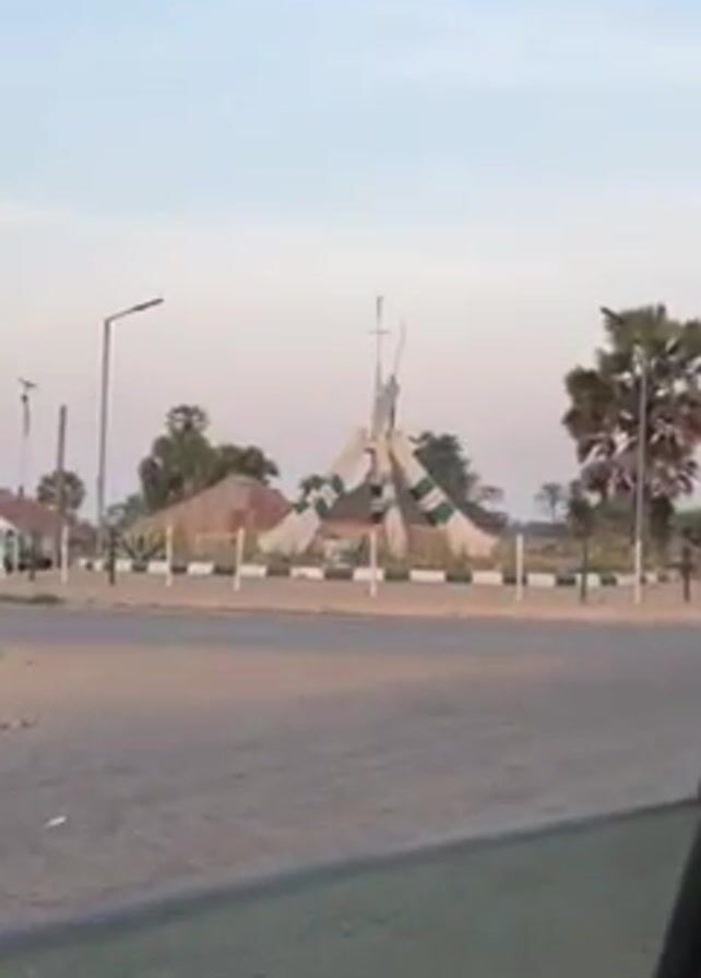 roundabout in a town or city, with a large sculpture in the center. The sculpture is made of white pillars with green stripes, arranged in a conical shape and supporting a cross or antenna at the top. There are palm trees and small buildings in the background. A motorcycle with two people riding on it passes in front of the roundabout. The video is taken from inside a moving car.