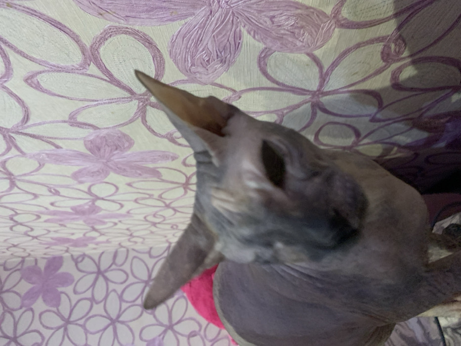 A hairless cat, likely a Sphynx, stands below the camera, looking up with its mouth slightly open. The cat's skin is a muted, mottled grey. Its ears are large and pointed, and its wrinkles are prominently displayed. The background is a patterned fabric or wallpaper with large, light purple and white floral designs. A glimpse of a pink item is visible near the cat's neck, potentially a piece of clothing or a blanket.