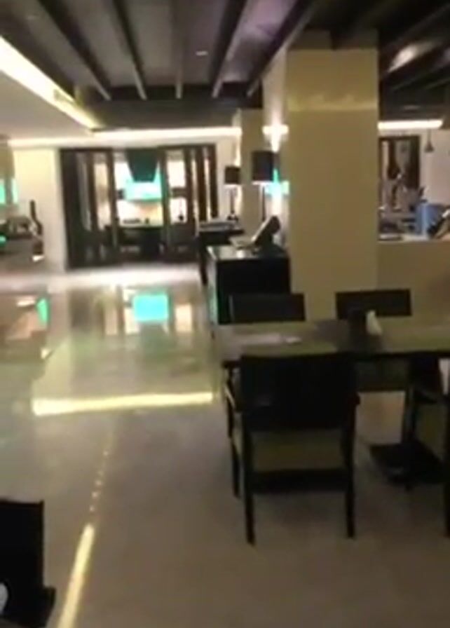 The camera pans around a well-lit dining area, showing a few dark-colored tables with matching chairs