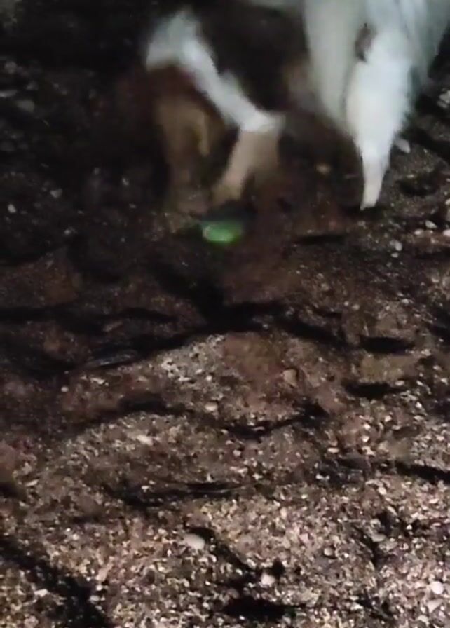 A dog is playing with a green ball on the ground. The dog is mostly white with some brown patches. The ground appears to be covered in dark, gravelly material. The scene is dimly lit.
