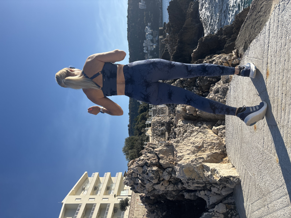 A single individual is observed from behind, standing on a textured light-colored paved pathway in Kunje, Montenegro. The subject is a person with blonde hair pulled into a ponytail, wearing dark sunglasses on their head, a dark blue sports bra with criss-cross back straps, matching dark blue leggings with a lighter mottled pattern, and dark blue athletic shoes with white soles. A white smartwatch is visible on the left wrist. To the subject's left, large light-colored rock formations rise from the pathway. Beyond these rocks, an off-white multi-story building with balconies is visible, situated near green foliage. To the subject's right and in the background, a body of water with gentle waves laps against rocky shores. Across the water, a distant coastline features scattered buildings and green hills. The sky is clear blue, indicating bright daylight, and shadows are cast on the pathway.