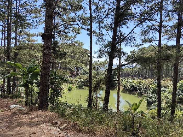 A serene view features a pond with light green water, surrounded by dense trees and vegetation. Pine trees dominate the landscape, interspersed with tropical plants, including banana trees. A dirt path or clearing is visible in the foreground, suggesting a natural setting. The scene is bathed in daylight under a blue sky, creating a peaceful and tranquil ambiance.