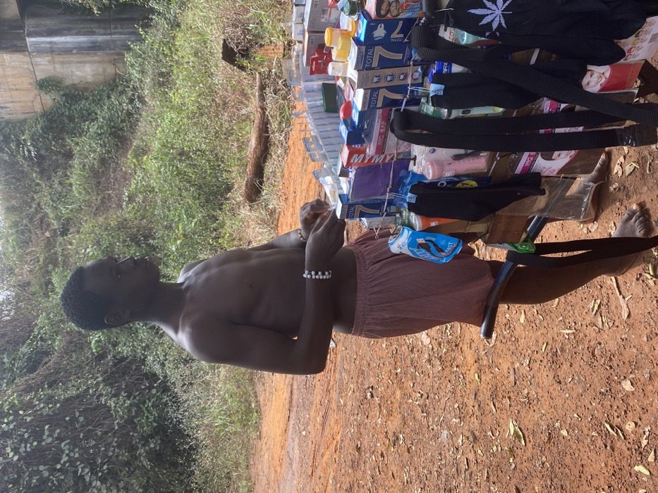 An outdoor scene in Ejule, Nigeria, features a male individual standing beside a merchandise stall