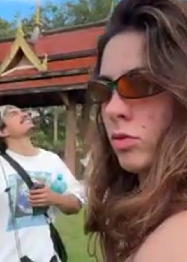 woman in sunglasses in the foreground with a man in the background. The woman has long brown hair and is looking off to the side. The man has a mustache and a bandana. He is holding a water bottle and has a camera around his neck. In the background, there is a Buddhist temple and a green lawn. The sky is partly cloudy. The camera is moving slightly, and there is indistinct chatter in the background.
