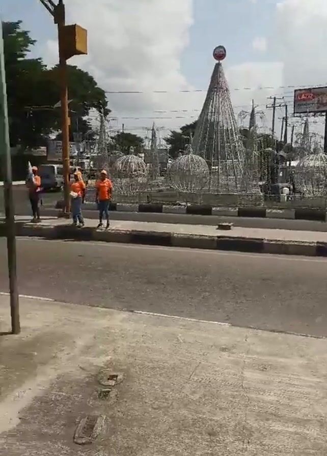 street in Nigeria. The street has some light traffic and pedestrians. There is a large Christmas decoration in a roundabout. In the second scene, a man is recording the street with his cell phone, holding a shopping bag. In the third scene, there is a person dressed in a gorilla suit entertaining people on the street.