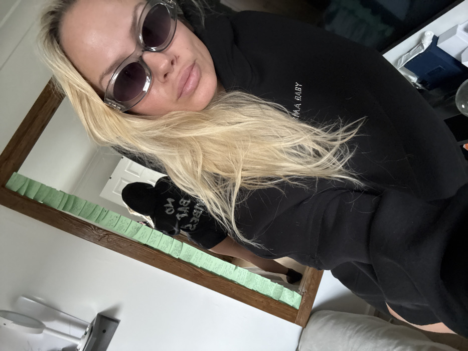 An individual with long, blonde hair and grey oval sunglasses is depicted indoors, taking a mirror selfie
