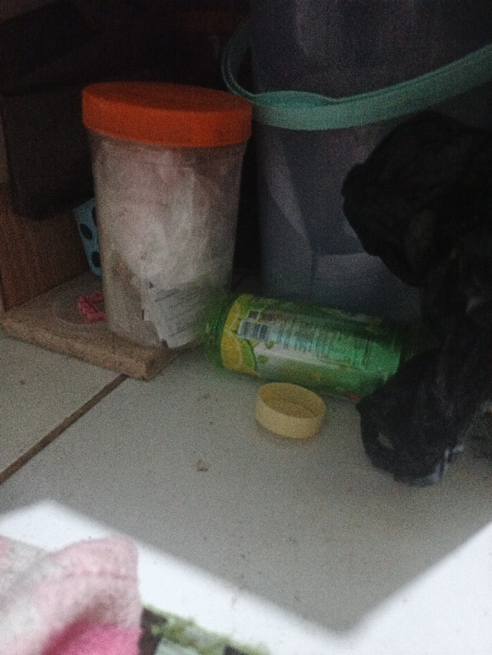 This image depicts a cluttered indoor storage area on a light-colored tiled floor in Bandung City, Indonesia. No individuals are present. **Subjects/Objects:** * A transparent cylindrical plastic container with an orange screw-top lid stands upright on the left, partially filled with a white granular substance. The container has a partial label attached. * Behind this container, a small wooden plank or block is visible on the floor, and behind it, a small blue perforated object and a small pink object are discernible. * A green plastic beverage bottle, possibly containing a yellow-labeled product, lies horizontally on its side to the right of the clear container. Product information and a barcode are visible on its label. * A detached yellow plastic bottle cap is situated near the neck of the green bottle. * In the background, a large, dark grey or black opaque plastic bucket with a teal handle is partially visible behind the clear container. * A dark, irregularly shaped object, possibly folded black fabric or a bag, is partially visible on the far right, near the green bottle. * In the immediate foreground on the lower left, a portion of a pink and white fabric item, possibly a towel or cloth, is visible. **Environment:** The floor consists of light-colored tiles with dark grout lines. The lighting is low and indirect, casting soft shadows, suggesting an interior space like a pantry, utility area, or under a counter. The overall impression is one of disorganized storage.