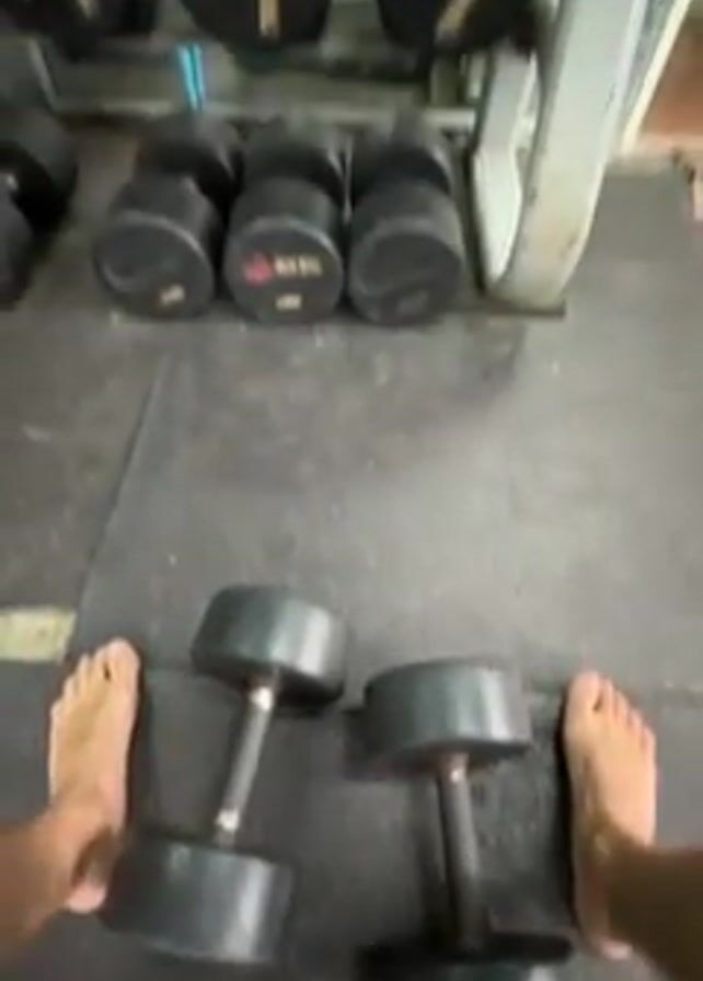 The video begins with a view of the feet of a person standing barefoot in a gym, positioned between two black dumbbells and the base of a weightlifting bench