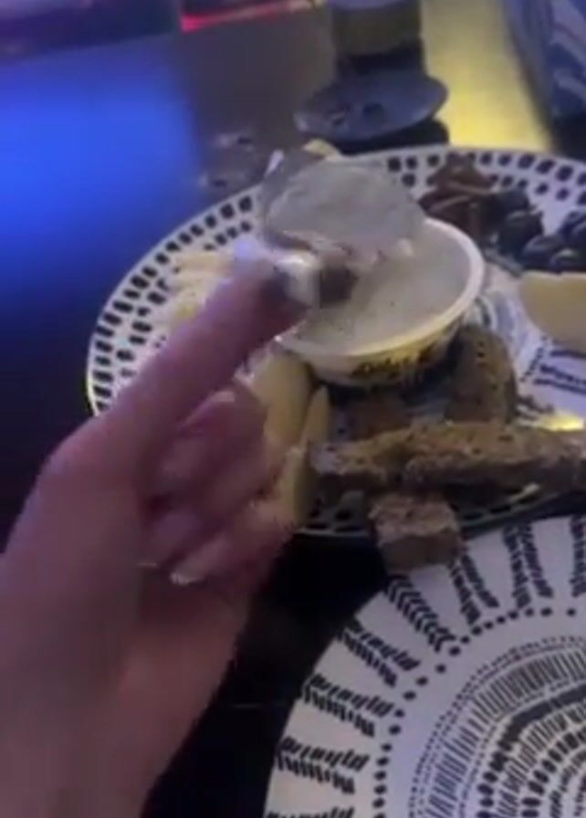 hand holding a small piece of food. In the background is a plate filled with food items, including apple slices, a small container of dip, pieces of bread, and blueberries. The plate has a black and white geometric pattern. Another plate with the same pattern is visible beneath the first plate. There is a bottle and a white box in the background. The lighting is mixed, with blue and white light sources.