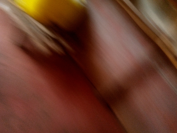 Blurred bands of color dominate the frame. A bright yellow area fades into a dark, muted brown. Diagonal reddish-brown hues are prominent, shifting in tone and intensity. Light streaks and shadows add depth and a sense of movement. The overall effect is abstract and indistinct, leaving the subject matter open to interpretation.