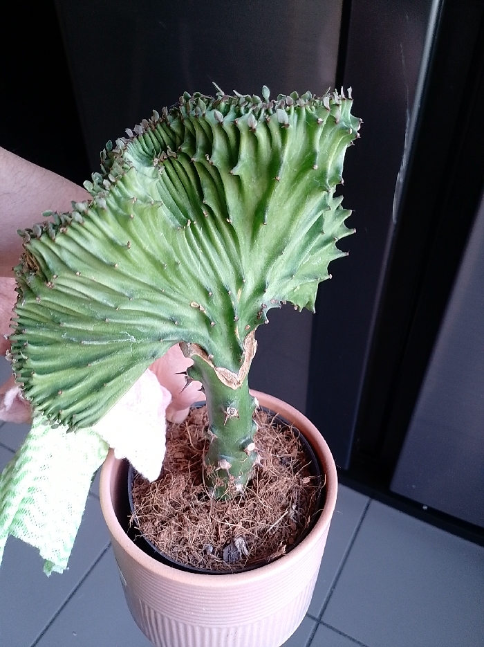 - "A light-skinned human hand partially supports a potted crested euphorbia plant, likely *Euphorbia lactea 'Cristata'*" by FM-5n8Vg2, licensed under CC BY 4.0