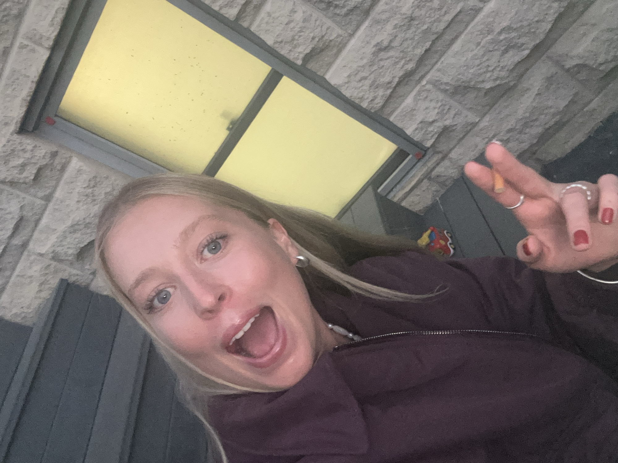 An individual with blonde hair and blue eyes is captured in a close-up, angled selfie. The person, appearing female, has her mouth wide open in an exaggerated expression. She wears a dark plum-colored collared jacket with a visible metal zipper and a light-colored beaded necklace. A silver hoop earring is visible in her left ear. Her right hand is in the foreground, displaying red painted fingernails and multiple silver rings on her fingers. She is holding a cigarette between her right index and middle fingers. The background features a textured grey stone wall on the right and a dark grey horizontal paneled surface on the left. A window with a dark frame and a bright yellow interior glow is visible on the right, above the stone wall, showing numerous small specks on its surface. A small red, blue, and yellow toy car rests on the dark grey paneled surface in the middle-ground. The lighting suggests dusk or an indoor setting with artificial light.
