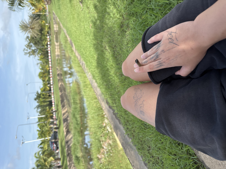 The image provides a first-person perspective of an individual seated on a grassy bank in Tambon Hua Toei, Thailand. The person wears black shorts, with a faint, light-colored tattoo visible on the upper left thigh. The right hand, featuring thin dark line tattoos across the fingers and the word "Feel" on the back, holds a partially consumed, lit cigarette or joint. In the foreground, green grass meets a concrete border alongside a narrow water channel containing grass and reflecting the sky. Beyond this, a paved road is visible, traversed by a dark sedan and lined with multiple streetlights. A dense treeline, including various palm trees, runs parallel to the road, separated by a white-and-red barrier. The sky is predominantly clear blue with scattered white clouds, indicating daytime conditions.