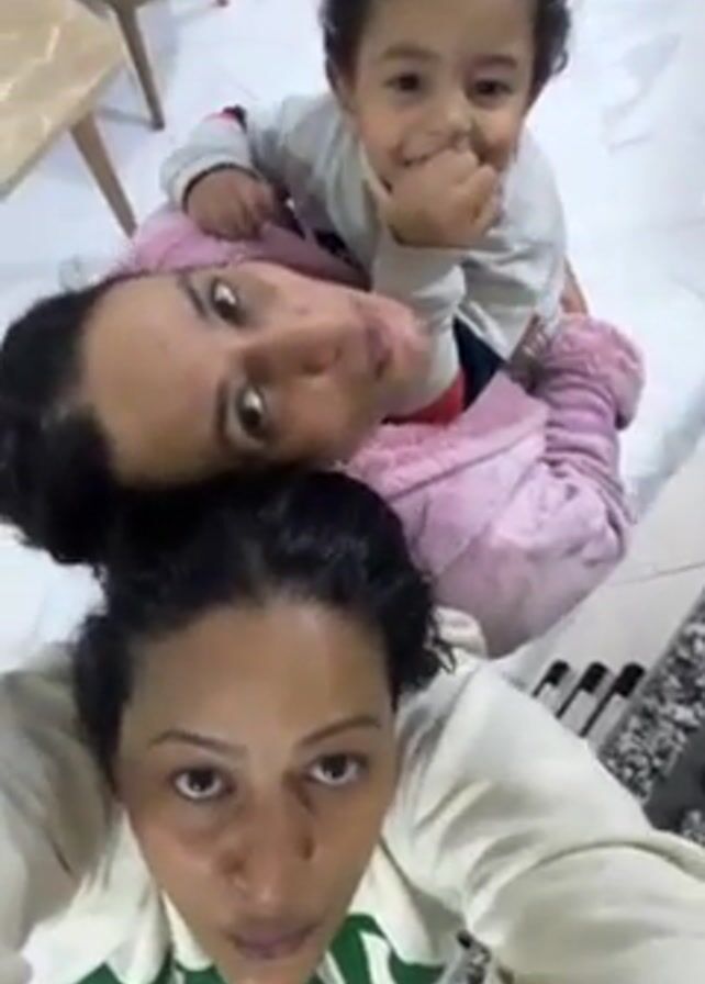 three people taking a selfie-style video. A young boy with curly hair is on top, wearing a light gray long-sleeve shirt. Below him is a woman in a pink fuzzy robe. The person holding the camera is another woman, who has her hair pulled back and is wearing a white shirt with green lettering. They are on a white surface, possibly a bed or floor. The boy is smiling and laughing. The two women also smile and laugh. In the background, a kitchen counter with a stovetop and some kitchen utensils are visible.