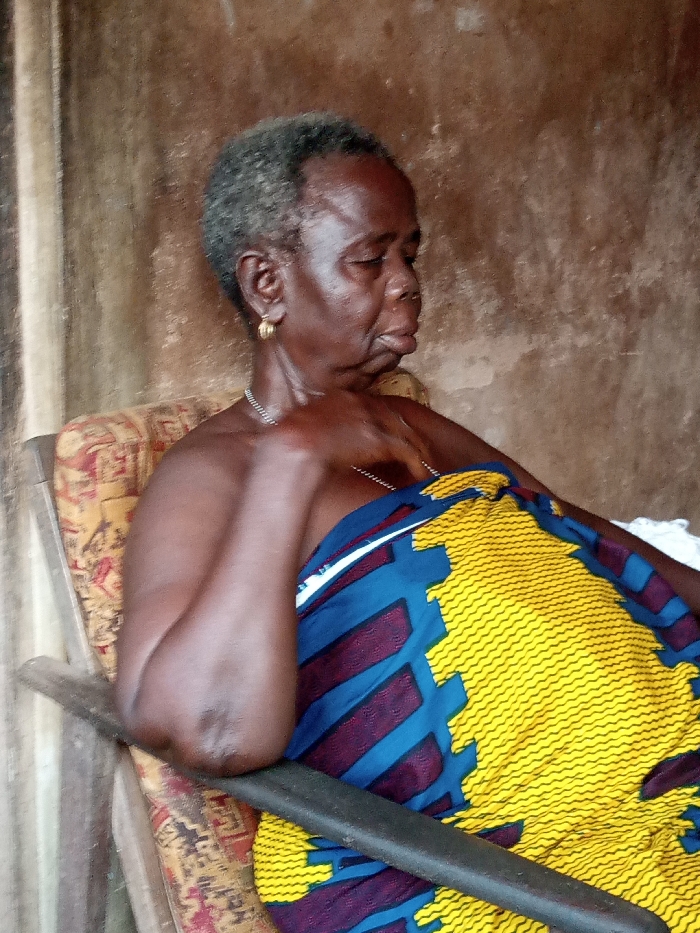 An elderly individual with dark skin and short, graying hair is seated in an upholstered armchair within an indoor setting in Okpatu-Ukehe, Nigeria