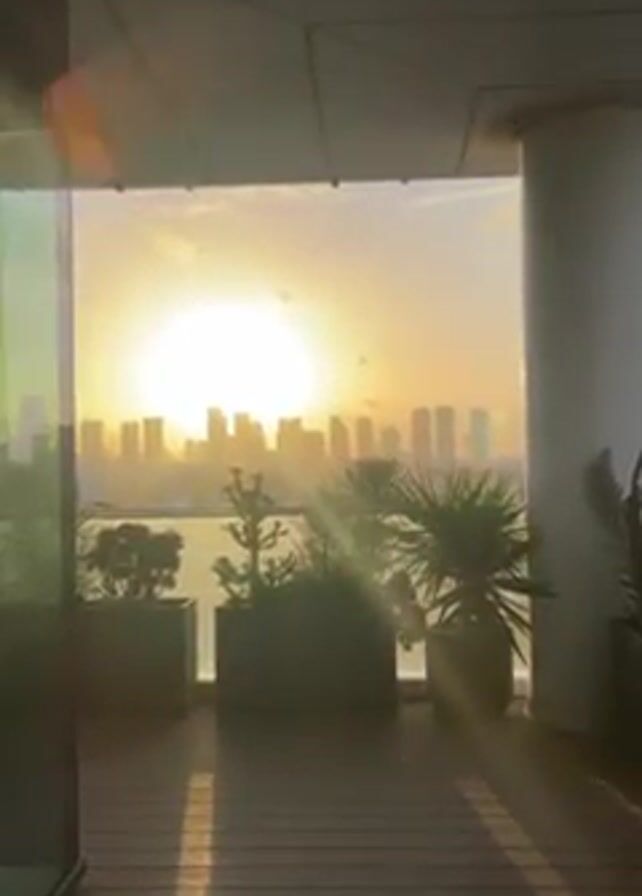 The video presents a serene view from an elevated balcony at sunrise or sunset. The city skyline is visible across the water, silhouetted against the glowing sun. Several potted plants adorn the balcony, adding a touch of nature. The balcony itself features a wooden floor and appears to be part of a modern apartment. The overall scene evokes a sense of tranquility and urban sophistication.