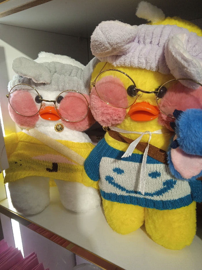 - "This image depicts two plush duck toys positioned side-by-side on a white display shelf, likely within a retail environment in Barza Municipality, Syria" by FM-zlWXg1, licensed under CC BY 4.0