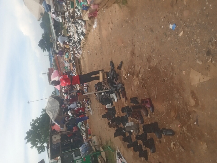 The image displays an outdoor informal market in Kakamega, Kenya. The ground is unpaved dirt, uneven, and features scattered debris. In the foreground and extending into the midground, numerous individual boots and shoes, primarily in black, brown, and grey, are laid directly on the ground, presumably for sale. A dark-skinned male, wearing a red short-sleeved shirt with white accents and dark trousers, stands centrally, holding an indistinct item in his hands. He is positioned near a small white stool and additional footwear displays. To the left, a market stall with a light-colored tarp roof exhibits hanging clothing. To the right, another expansive display of shoes, predominantly white and black, covers the dirt surface. Multiple individuals are present throughout the midground, observing or interacting with goods among various makeshift market stalls constructed with tarpaulins and corrugated iron. Green trees and additional structures are visible in the background beneath a partly cloudy sky.