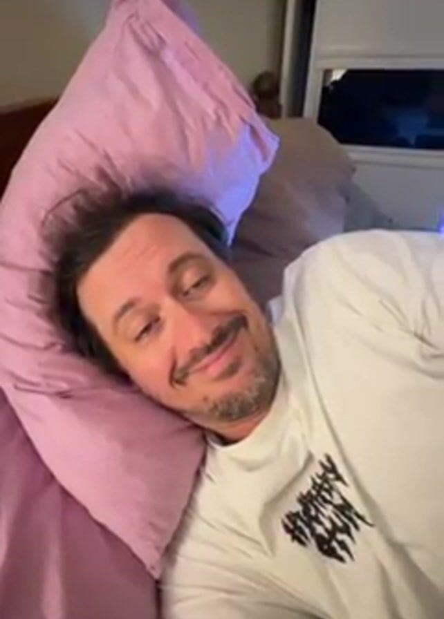 A man with dark hair and a beard lies on a bed with a pink pillow, smiling and waving his hand at the camera