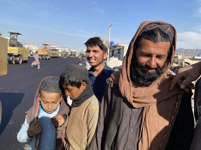 The image depicts a daytime scene in Gundigan Village, Afghanistan, featuring a group of individuals in the foreground against a backdrop of road construction and urban elements. In the immediate foreground, from right to left: An adult male with a full black beard and dark hair, wearing a brown headscarf and a dark brown tunic, looks downward with a slight smile. A lighter-skinned hand rests on his right shoulder, belonging to an unseen individual. To his left and slightly behind, a younger man with short dark hair and a white patterned cap smiles broadly, wearing a dark blue collared shirt. Further left, two boys are positioned. The boy on the far left, wearing a light blue tunic and a patterned shawl, looks down while adjusting his garment. Next to him, a second boy with a dark cap and a brown patterned tunic also looks downwards. The midground reveals a freshly asphalted road under construction. A large yellow road roller with two drums is visible on the left side of the road. Further down, another piece of heavy machinery operates. A person in a light-colored tunic is depicted running from left to right across the newly paved road. The background consists of low-rise buildings with light-colored facades, some featuring blue water tanks on their roofs. Utility poles with power lines traverse the scene. The sky is clear and blue. In the distant background, rugged, light-colored mountains are visible. Bright sunlight illuminates the scene, casting clear shadows.