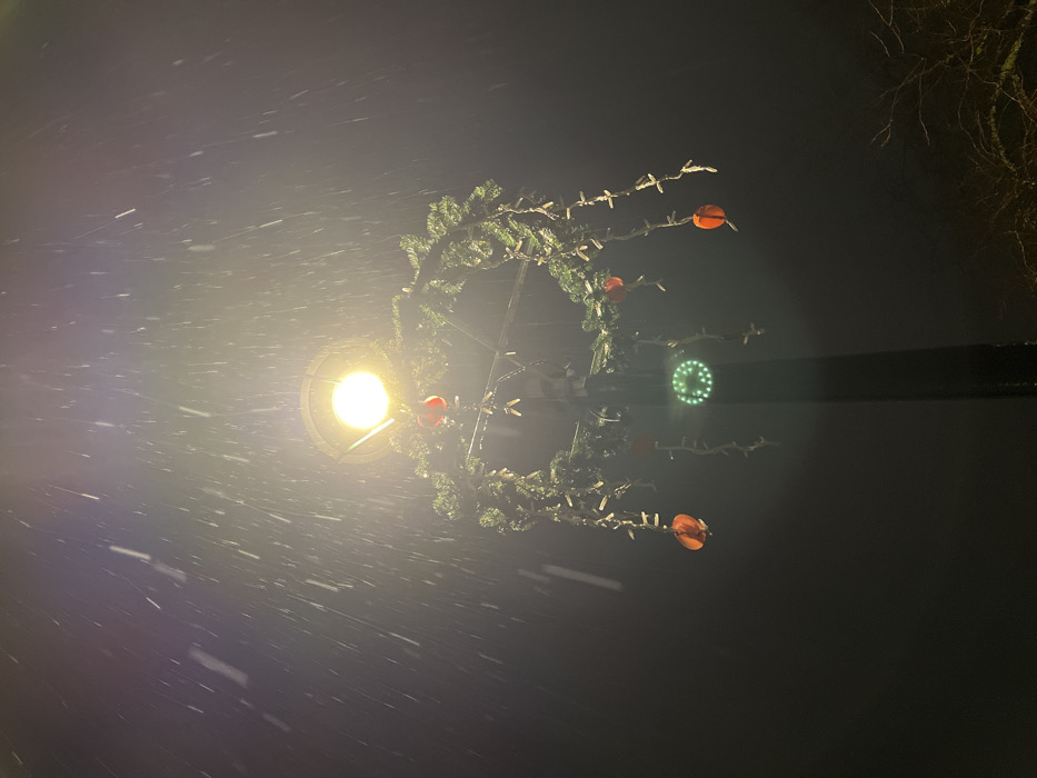 A low-angle shot at night shows a snowstorm around a lit street lamp decorated with a circular evergreen wreath adorned with red ornaments and smaller white lights. The lamp casts a bright, yellow glow through the falling snow. A dark pole supporting the lamp stretches horizontally across the upper-middle ground, reflecting a green light. Bare tree branches are visible in the dark upper-right corner.