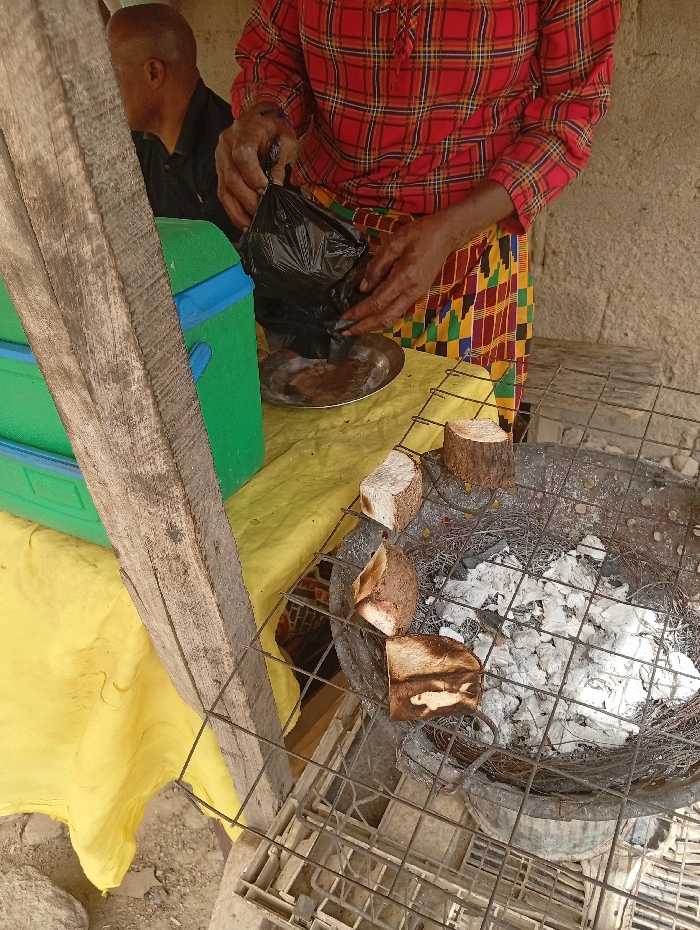 The scene depicts an outdoor food preparation area in Sabon Gari West, Nigeria. An individual, wearing a red plaid long-sleeved shirt and a multi-colored patterned wrapper, uses both hands to manipulate a black plastic bag over a small metal dish resting on a yellow fabric-draped surface. Their hands exhibit dark discoloration. To the left, a green cooler with blue latches sits on the yellow fabric. In the background, a bald male wearing a black shirt is partially visible, facing away from the camera. To the right, a charcoal grill setup features white ash within a circular base, topped by a metal grate. Four pieces of roasted tuber, possibly yam or sweet potato, rest on the grate, displaying varying degrees of charring. A rough-hewn wooden post is positioned vertically in the left foreground. The background consists of a textured, light-colored wall. The ground appears uneven beneath the yellow fabric.