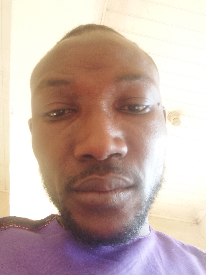 A close-up shot of a dark-skinned man's face with a short beard. The lighting is bright, causing some overexposure. He has dark eyes, a prominent nose, and full lips. He is wearing a purple shirt. The background is a plain white wall, and what appears to be a light fixture is visible above him. The angle is slightly from below, looking up at the face.